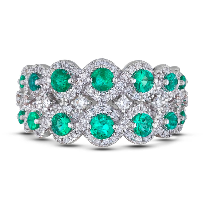Gold cocktail ring featuring fourteen genuine, natural 0.72 ctw round Emeralds, accented by 132 0.80 ctw side Diamonds. Set in 14 K Gold.