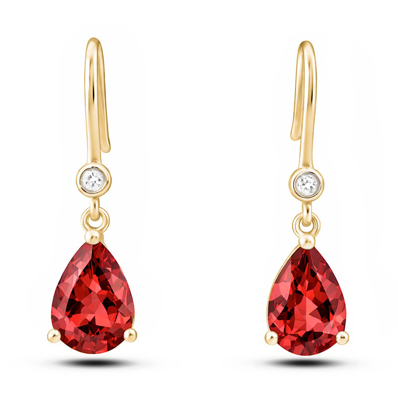 Gold earrings featuring two 0.80 carat total weight genuine garnets, accented by two 0.01 carat total weight brilliant cut diamonds. Set in 10k gold.
