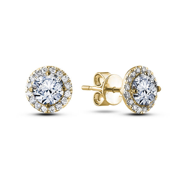 Diamond halo earrings featuring 0.50 carat total weight of Canadian Diamonds, accented by 0.12 carat total weight side Diamonds. Set in 14 K Gold.