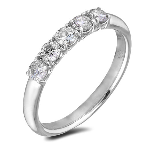 Five-stone ring featuring round brilliant-cut Canadian diamonds with a total weight of 1.00 carat. Set in 14 K gold.