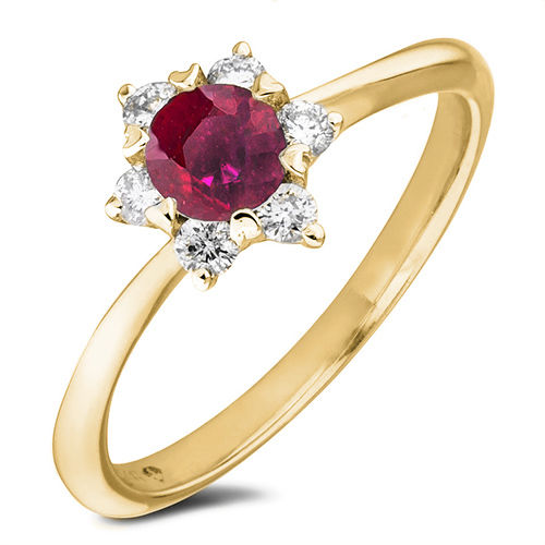 Gold flower halo ring featuring a genuine, natural 0.30-carat round brilliant-cut Ruby, accented by six side diamonds with a total weight of 0.15. Set in 10 Karat gold.